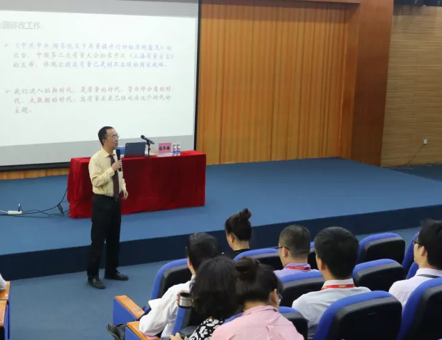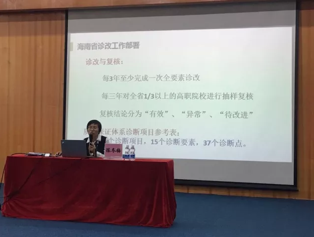 在培训会中,教务处副处长陈冬梅副教授系统、全面地介绍了在国家高度重视“高质量发展”的时代主题下,诊改工作的理念与实施方法。陈冬梅副教授首先介绍了诊改工作的背景及国内诊改工作的进展情况。其次,依据海南省245号文件精神,解读了海南省诊改工作的具体部署。接下来,重点分享了诊改理念与实施方法,并结合全国诊改专委会主任杨应崧的培训主旨报告、淄博职业学院、黄河水利职业技术学院、天津第一商校等诊改案例,详解了“五纵五横一平台”的质量保证体系和“8字型”螺旋的单元运行机制,强调了“打造两链”是诊改的起点、信息化平台建设是诊改工作落地的重要保障。最后,介绍了学院近几年诊改工作进展情况,面临的挑战和对策,并确立了后续工作的基本思路。