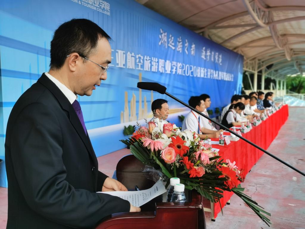 学校党委书记、董事长兼校长杨涵涛发表了开学典礼讲话。杨校长特别指出,在海南建设全球自贸港的背景下,2020级新生们的到来,恰逢其时。而弘扬三亚航院精神,逐梦海南自贸港建设,则是伟大新时代在这个特殊的时间点,赋予三亚航院学子的重大使命。随后,杨校长结合校友事例,从奋斗精神、工匠精神、奉献精神、愚公精神等几个方面对三亚航院精神进行了具体阐述,他勉励同学们:“光荣的三亚航院精神,已从你们的师长传承到你们这一代。希望在你们的手中,三亚航院精神能得到继承、充实和发扬光大,在建设海南自贸港和实现中国梦的新征程上创造新的历史伟业!”