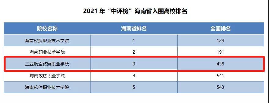 近日,“金平果排行榜”(中评榜)整理发布了2021中国高职院校竞争力排行800强名单,海南地区共5所高职院校榜上有名,我校位列海南省第3名!