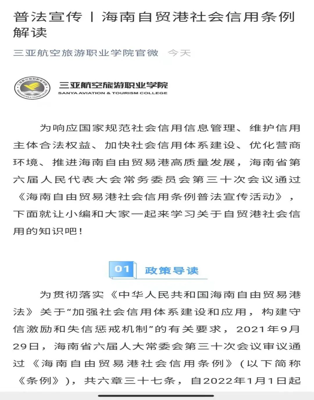 社会信用体系建设是社会主义市场经济体系的重要组成部分,是法治国家建设的重要内容,特别是信用条例的颁布推动了信用体系建设的加速发展,高校处于社会体系中不可或缺的地位,特别是校园内的社会信用条例宣讲、信用体系建设工作至关重要,我校积极响应三亚市发展和改革委员《关于开展〈海南自由贸易港社会信用条例〉普法宣传活动的通知》(三发改函(2021)1826号)文件的要求,进行了认真部署,精心宣传。