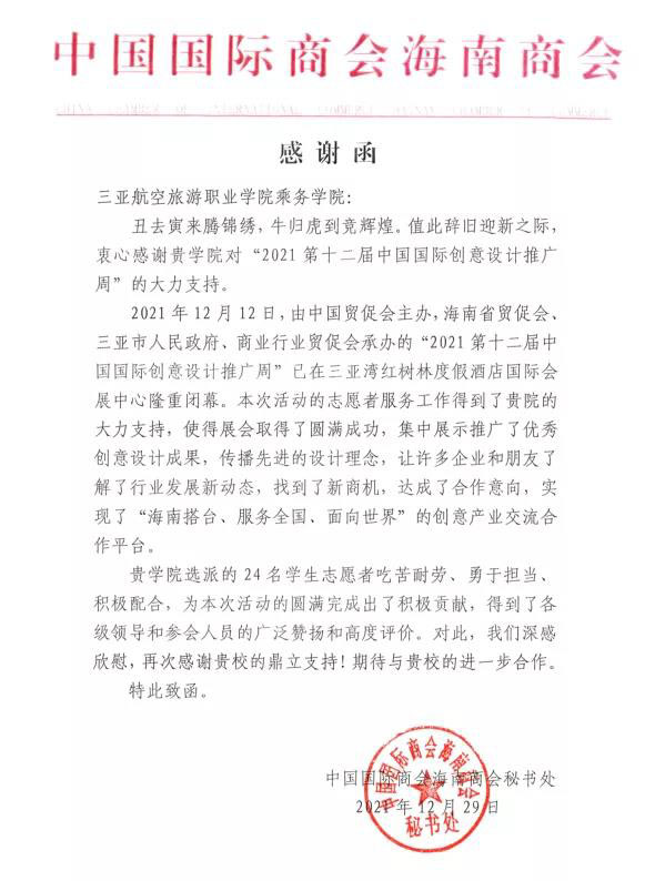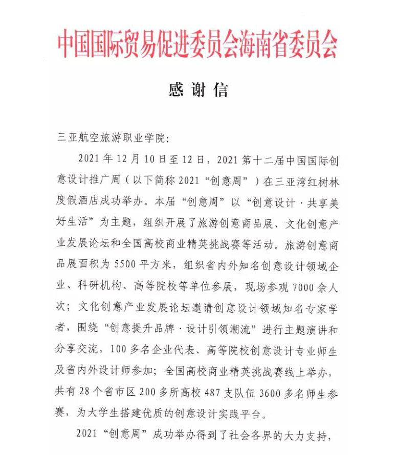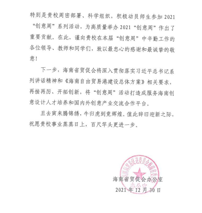 近日,海南省贸促会和中国国际商会海南商会向我校致感谢信,对我校在2021年第十二届中国国际创意设计推广周(以下简称“创意周”)中做出的重要贡献,致以最衷心的感谢和最诚挚的敬意。