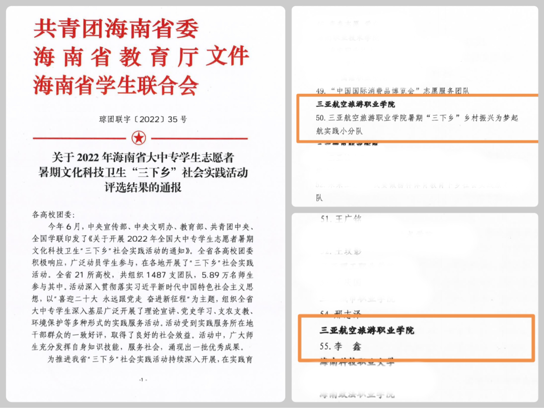 近日共青团海南省委、海南教育厅发文通报,开云kaiyun登录入口暑期“三下乡”乡村振兴为梦起航实践小分队在2022年暑期开展社会实践活动被评为2022年海南省大中专学生志愿者暑期文化科技卫生“三下乡”社会实践活动优秀团队。指导老师李鑫荣获“优秀指导教师”称号。