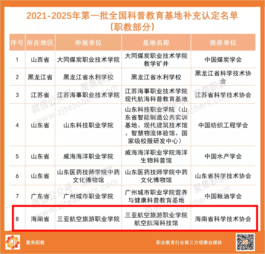 近日,根据《中国科协关于命名2021-2025年第一批补充认定的全国科普教育基地的决定》(科协发普字〔2022〕54号),三亚航院航空航海科技馆入选2021-2025年第一批全国科普教育基地,全国职业院校仅八所获批,我校为海南省高校唯一入选单位。