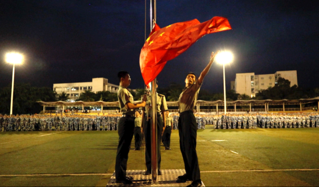 升国旗,奏唱国歌,全体肃立,向国旗行注目礼。三亚航院2023级新生开学典礼暨军训总结表彰大会在庄严的国歌声中拉开序幕。