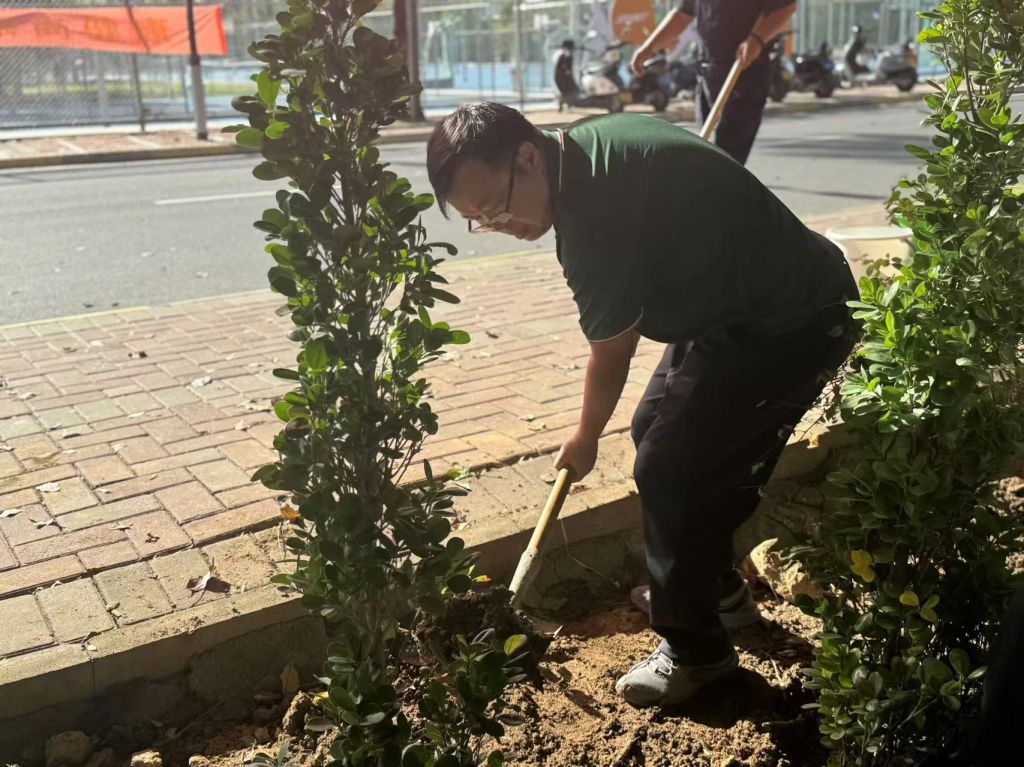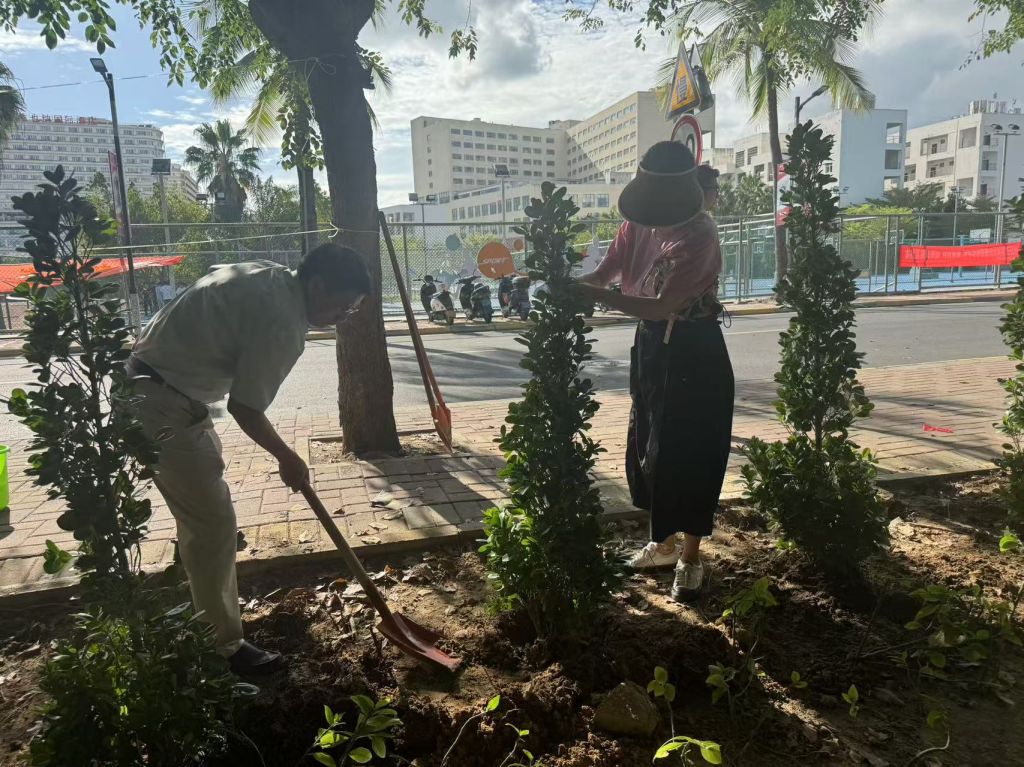 植树节当天下午,阳光明媚,微风轻拂。三亚航院物业提前准备了各类植树工具以及茁壮的火山榕树苗。在党委副书记、副校长岳军的带领下,教职工们热情高涨,分工协作,挥锹铲土、扶正树苗、浇水灌溉。大家齐心协力,将一棵棵充满生机的小树苗栽种在校园的沃土中。