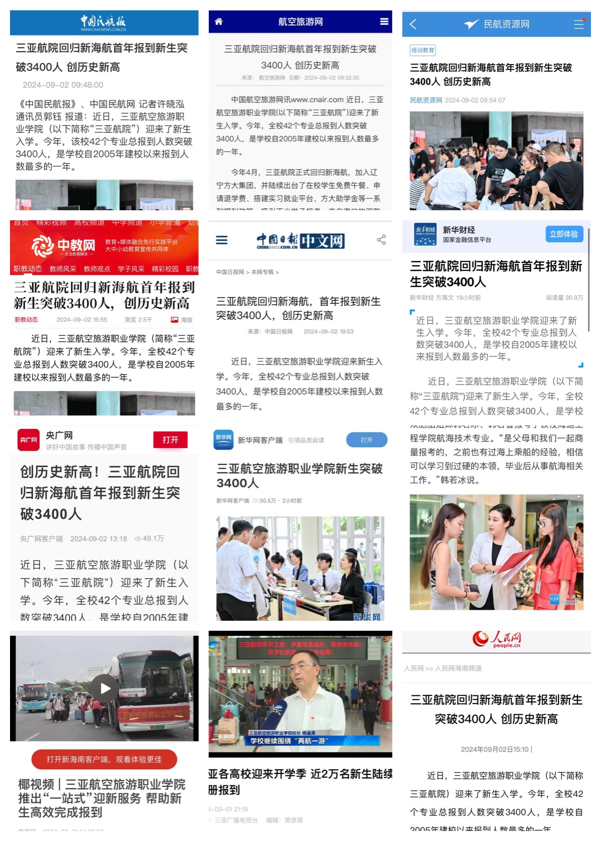近日,中国民航报、航空旅游网、央广网、新华网、人民网、民航资源网、中教网、中国日报、中教网、华人头条、陆海财经、大象新闻、华夏经济网、云南网、中华网、新华财经、海南日报、南海网、三亚日报、三亚电视台等多家媒体对三亚航院回归新海航首年报到新生突破3400人进行了报道。