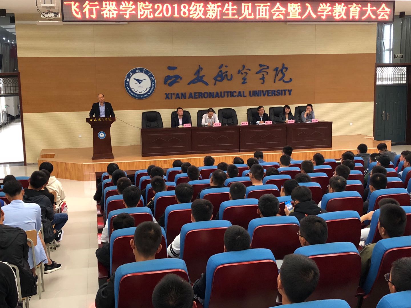 9月20日上午,pg国际在阎良校区阶梯一报告厅举行2018级新生见面会暨入学教育大会。院长郝红武、党总支书记董彦非、党总支副书记杨光、学生管理科科长杜长龙、综合管理办公室主任赵慧凯、彭玉海教授、飞行器设计教研室主任梁毅辰、飞行器制造工程教研室主任余斌高以及团总支书记冯仑仑及2018级辅导员杨立、李亮和新生各班级班主任等学院领导老师出席此次大会, 学院2018级本专科新生到场参加。会议由杜长龙主持。
