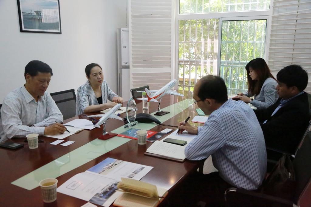 参观该公司办公区后,双方就飞行技术专业申报进行了交流探讨。该公司市场营销部经理刘小南向郝红武一行介绍了公司已经取得的资质、师资力量以及飞行训练基地等情况;该公司培训部经理彭明权就学员培训工作做了详细的介绍说明。郝红武也就飞行技术专业申报工作相关材料的准备、双方共同培养学生的模式、飞行训练的实施、学生停飞后的安置等一系列设想与该公司领导做了深入细致的讨论。