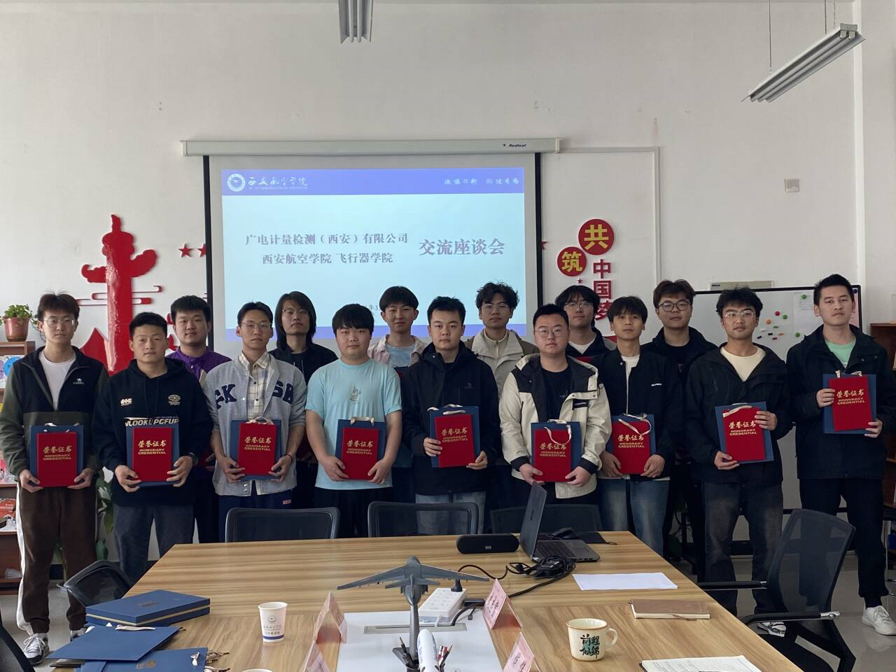 2025年1月,飞行器设计与工程专业15名学生赴蒲城机场完成为期4周的生产实习,本次实习为专业首次参与国内飞机试验科研项目。座谈会上,广电计量(西安)有限公司对pg国际电子网站学生在实习工作过程中参加AG600降雪试验的表现表示充分的肯定,并对pg国际电子网站给予的支持表示感谢。向学院赠送了“传道授业,育时代栋梁;校企携手,谱发展新篇“,并为参与试验的同学颁发证书。