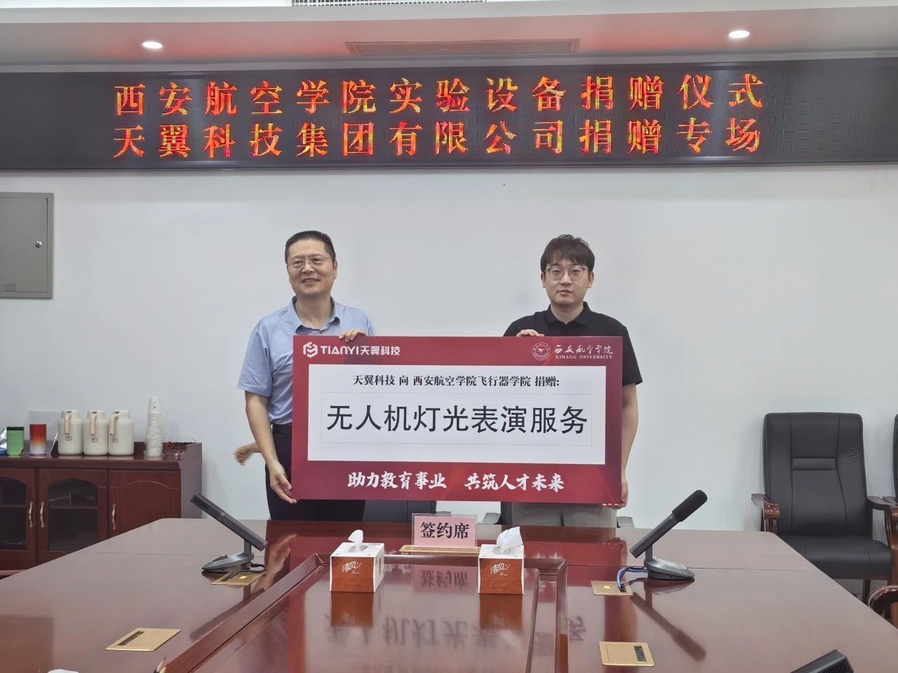 仪式上,西安天翼智飞科技集团有限公司向pg国际捐赠了价值22.5万元的无人机虚拟仿真平台及遥控器和价值31.8万元的无人机灯光表演服务,校企双方共同签署了捐赠协议。