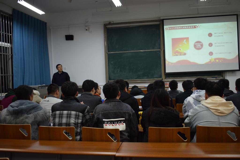 会上,杨光副书记讲到,今年是我们建党98周年,建国70周年,从党的一大到党的十九大以来我们党带领中华民族取得现有成绩,来之不易我们要陪加珍惜当前取得伟大成绩,永远跟党走。随后,杨光副书记在回顾党的发展历史以及马克思主义在中国的发展历程,98年来中国共产党人把马克思主义与中国国情相结合,走出了符合中国国情的道路先后形成了毛泽东思想、邓小平理论、三个代表、科学发展观和习近平新时代中国特色社会主义思想,作为当代大学生我们要坚定“四个自信”不断丰富马克思主义中国化的精神内涵。最后杨光副书记总结到,历史是一个民族安身立命的基础,以史为鉴、不忘历史才能不断地吸收历史经验和教训,整装待发,继续前进。讲课过程中各位同学积极提问,学习热情高涨,党员们认真听讲,仔细地完善笔记,取得了良好效果。