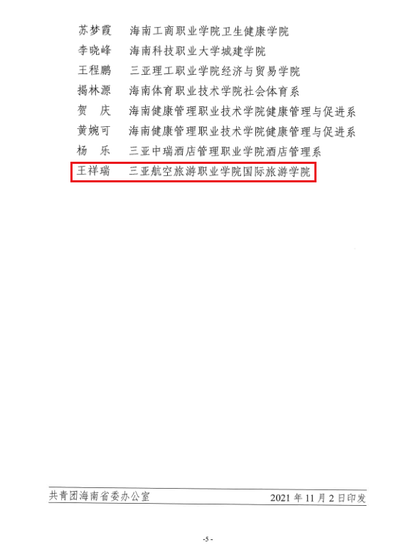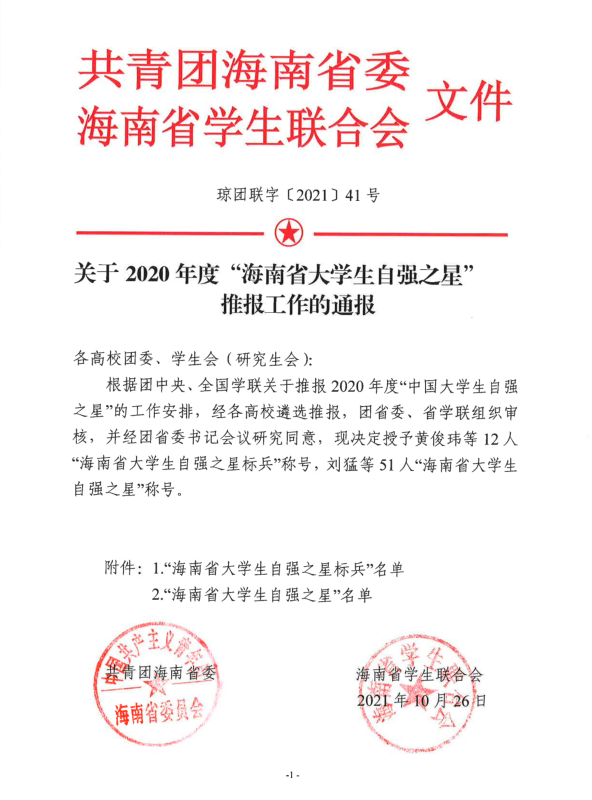 授予王祥瑞“海南省大学生自强之星”称号通报