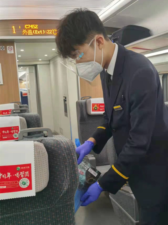 盛禹宁的工作内容主要包括:在门口立岗迎接旅客上车、检票、提醒旅客戴好口罩、给旅客测体温、巡视车厢摆放好行李架、检查列车药箱配备药类是否齐全、检查灭火器确保列车消防安全等事项。