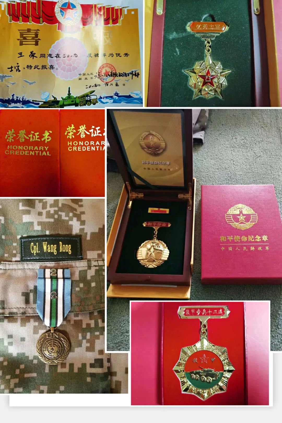 王荣,江苏宜兴人,中共党员。我校2019级乘务学院民航空中安全保卫专业学生。2014年9月入伍,在部队五年期间参加两次重大演习、一次旅级大比武、一次赴南苏丹维和,荣获“优秀训练标兵”“嘉奖”“优秀士官”各一次。在2017年执行为期一年的“中国第八批赴南苏丹(瓦屋)维和”任务中,由于表现优异,被联合国授予“二级维和勋章”。