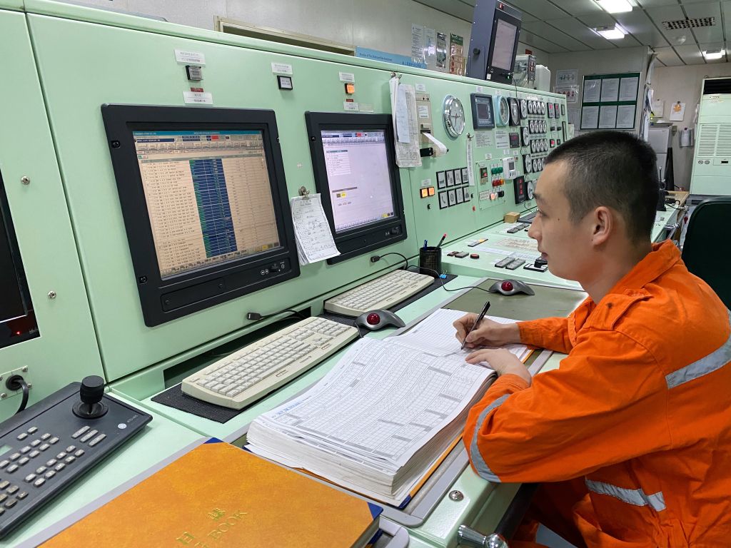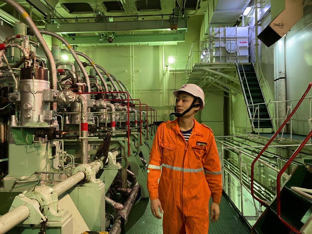 欧泽宁同学现在在“YM UPWARD”(常明)轮上实习,在实习期间,他积极服从船舶领导的各项工作安排,轮流跟各轮机员一起工作,对管轮所负责的设备进行维护保养,确保设备的正常运行。下班后的闲余时间,他还仔细阅读各设备的说明书,了解设备工作原理及故障处理等。在外贸船上工作经常需要跟外国人进行沟通交流,对英语听力和口语要求比较高,他在完成工作之余,每天坚持至少抽出两个小时来学习和练习英语,以期实习完后能够成为一个合格的远洋三管轮,正式任职后他的月薪为5800美金。