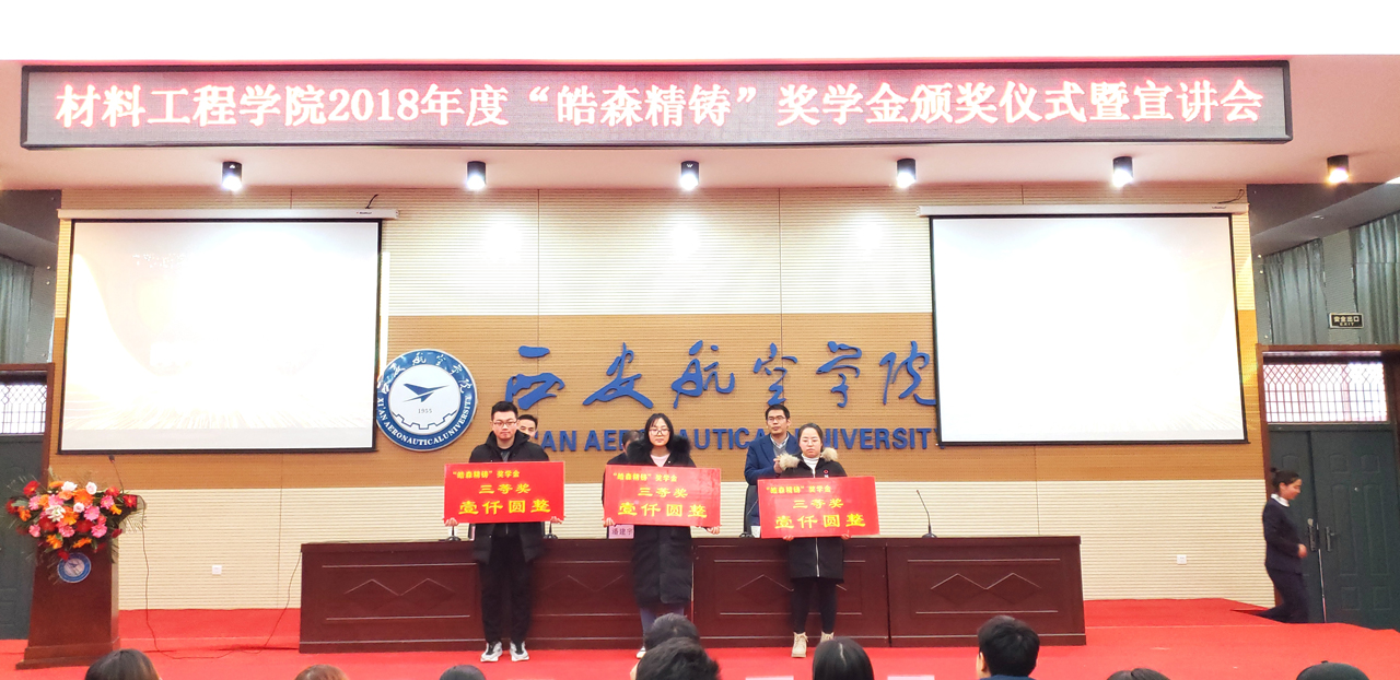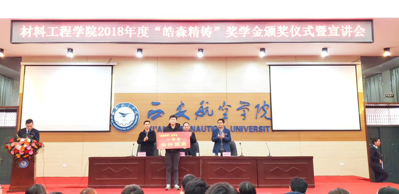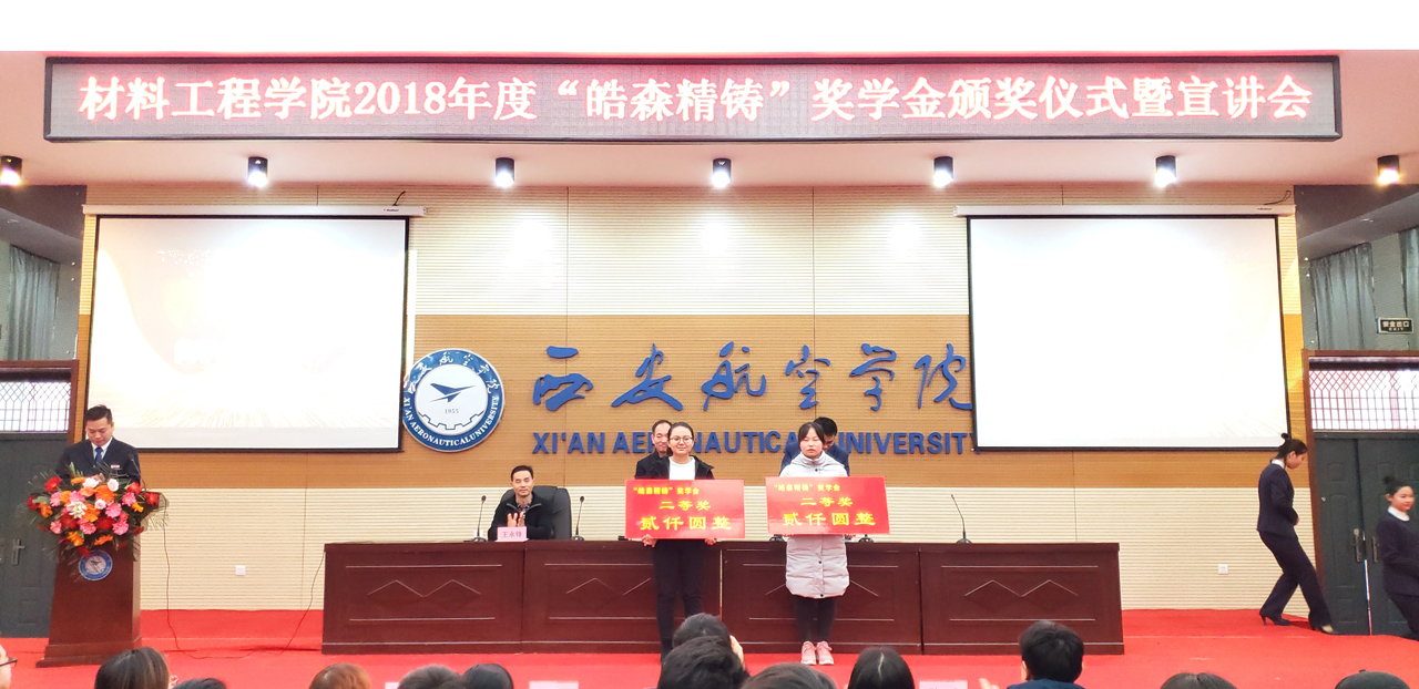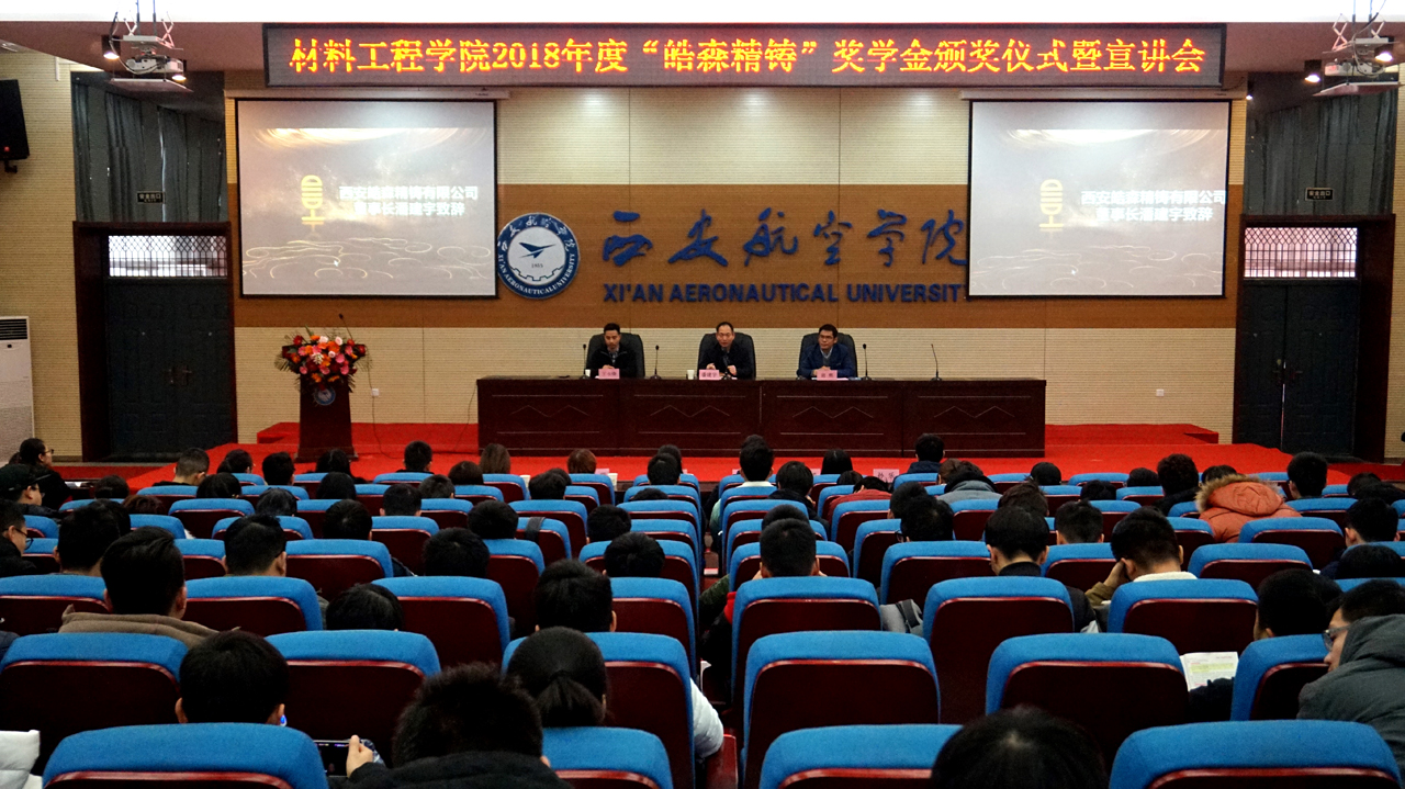 2018年12月14日上午10点30分,pp电子游戏官网2018年度“皓森精铸”奖学金颁奖仪式于阎良校区报告厅举行。出席本次会议的有西安皓森精铸有限公司董事长潘建宇,pp电子游戏官网院长谢辉,党总支书记王永锋以及部分pp电子教师代表,此次会议由学生管理科科长张赛主持。