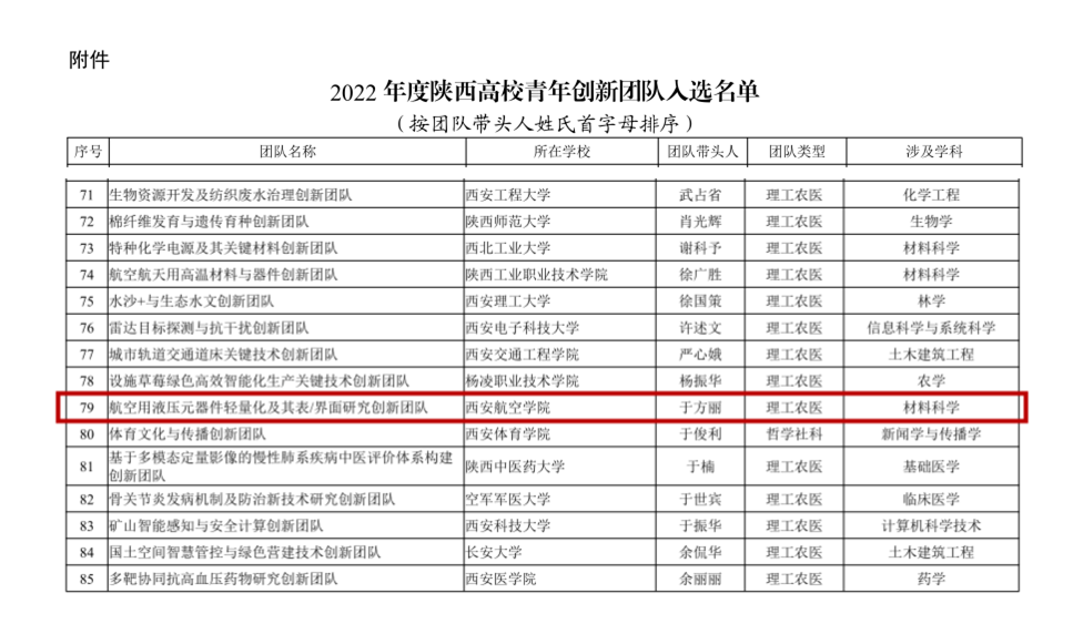 近日,陕西省教育厅发布了《关于公布2022年度陕西高校青年创新团队入选名单的通知》(陕教函〔2022〕943号),pp电子pp电子游戏官网于方丽教授带领的“航空用液压元器件轻量化及其表/界面研究创新团队”成功入选2022年度陕西高校青年创新团队,这是pp电子团队首次入选陕西高校青年创新团队,实现了学校在该领域的历史性突破。