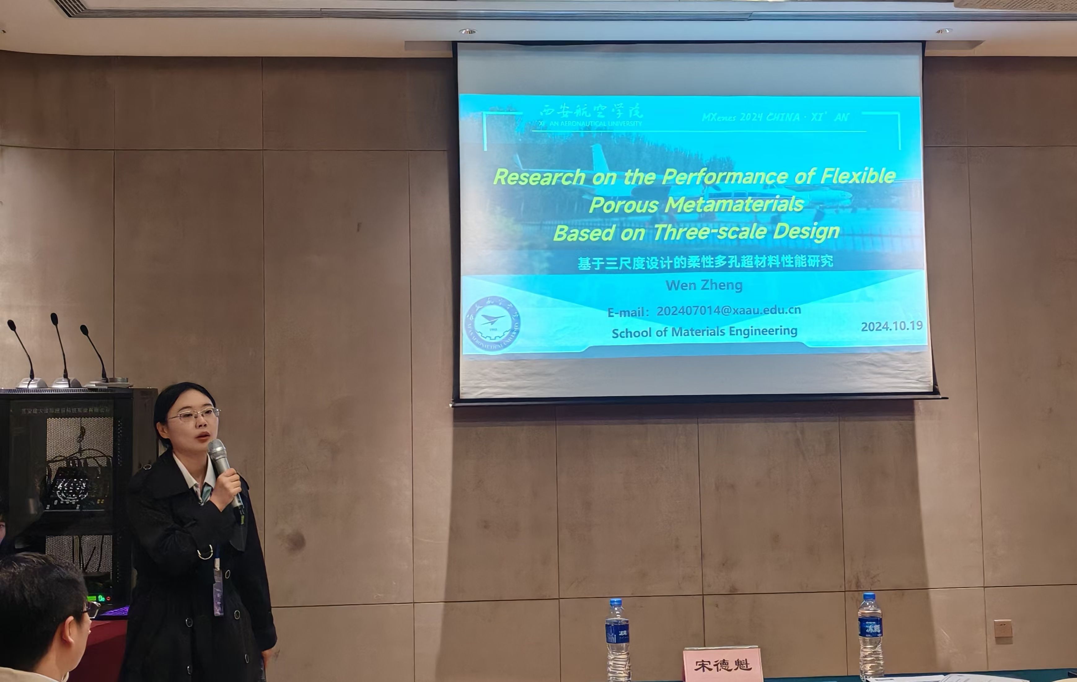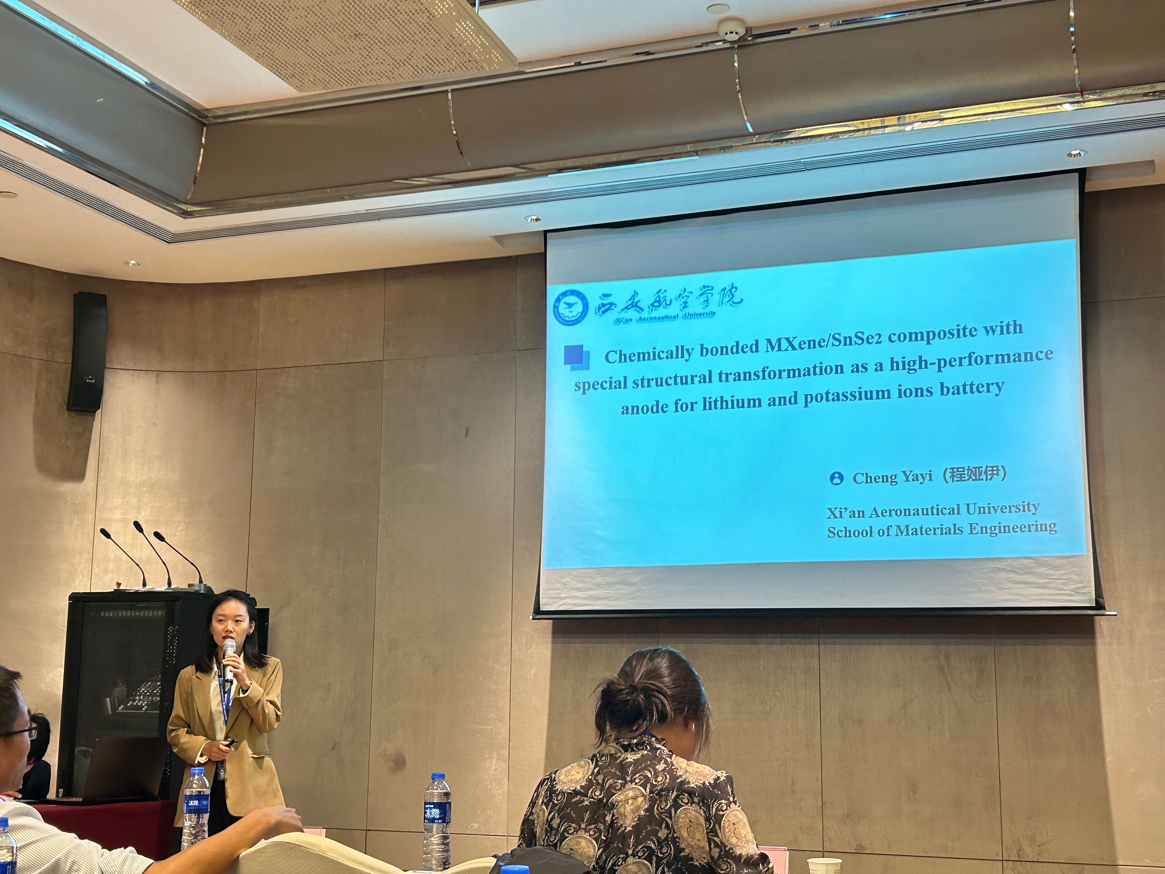 在本次会议上,pp电子游戏官网的两位教师——程娅伊和郑文,分别就各自的研究领域进行了学术报告,展示了学院在材料科学领域的最新研究成果。程娅伊老师作了题为《Chemically bonded MXene/SnSe2 composite with special structural transformation as a high-performance anode for lithium and potassium ions battery》的报告。主要聚焦于通过化学键合MXene/SnSe₂复合材料,利用其特殊的结构转变来提升锂离子和钾离子电池的性能。此项研究不仅为新型电池材料的设计提供了全新的思路,也为未来高性能储能装置的开发奠定了理论基础。郑文老师则带来了题为《Research on the Performance of Flexible Porous Metamaterials Based on Three-scale Design》的报告,分享了在基于三维尺度设计的柔性多孔超材料性能研究方面的最新进展。此项研究对于航空材料的轻质化、柔性化以及多功能化具有重要的应用前景,对于提升材料的结构功能一体化具有深远意义。
